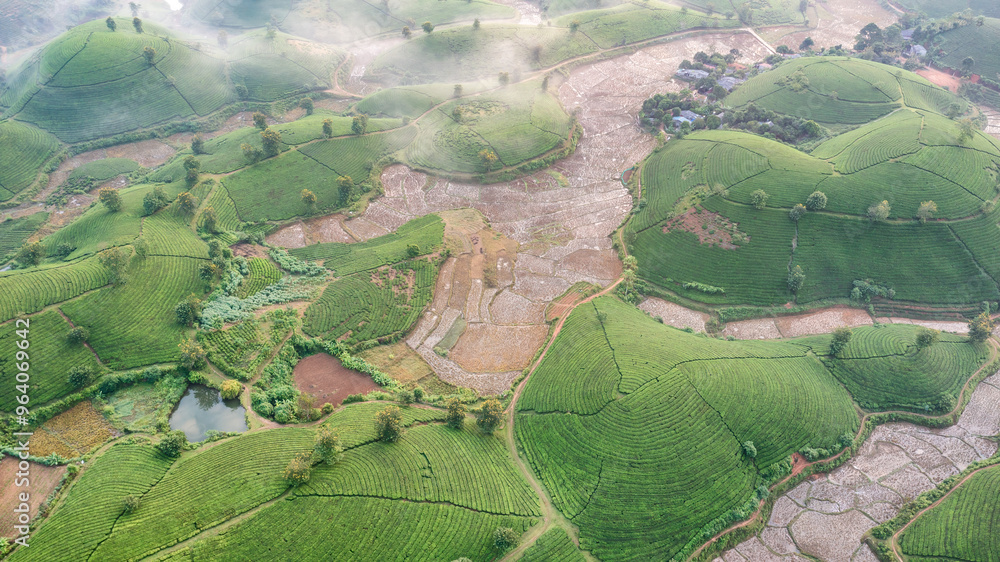 Beautiful aerial view of Long Coc tea hills. Long Coc in Phu Tho Province, Vietnam