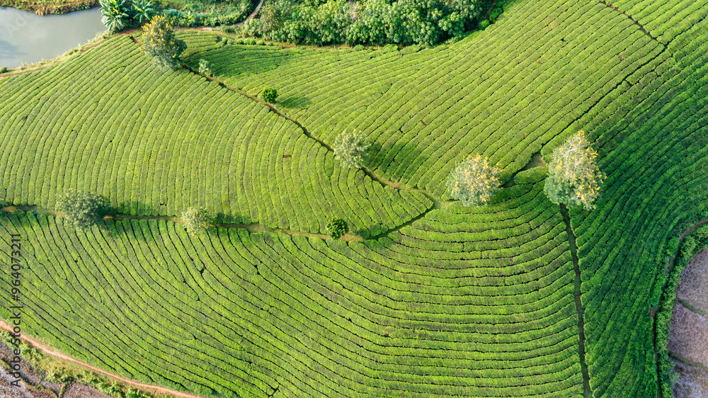 Beautiful aerial view of Long Coc tea hills. Long Coc in Phu Tho Province, Vietnam