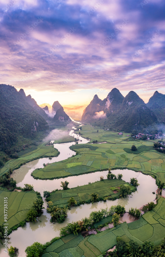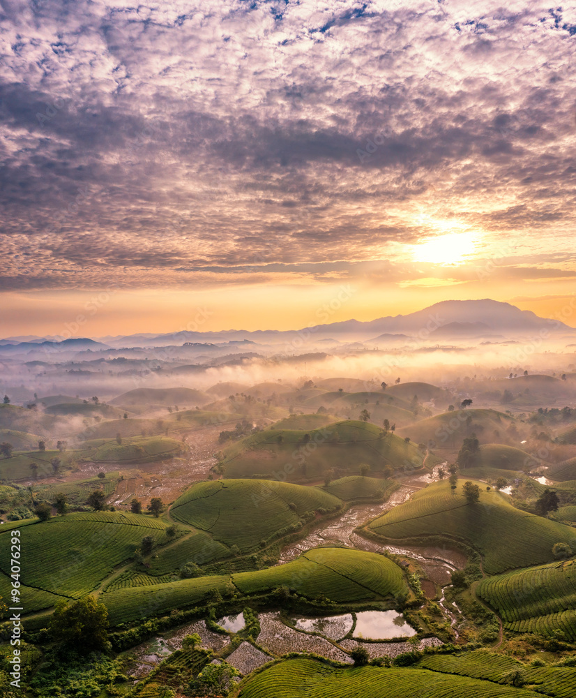 Beautiful aerial view of Long Coc tea hills. Long Coc in Phu Tho Province, Vietnam