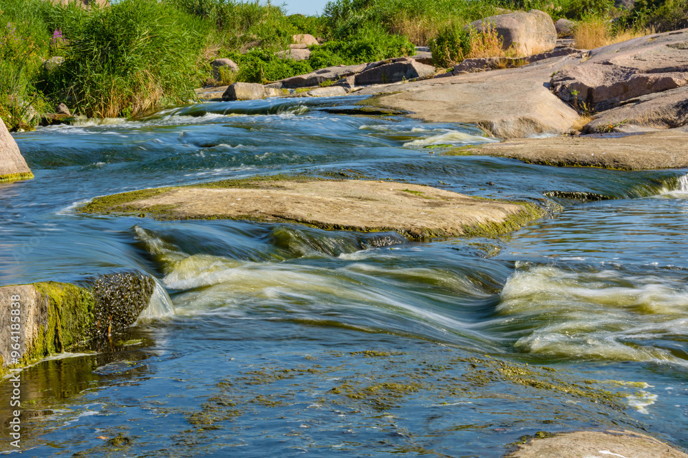 View on Tokovsky waterfalls and rapids on the Kamianka river. Dnipropetrovsk region, Ukraine