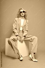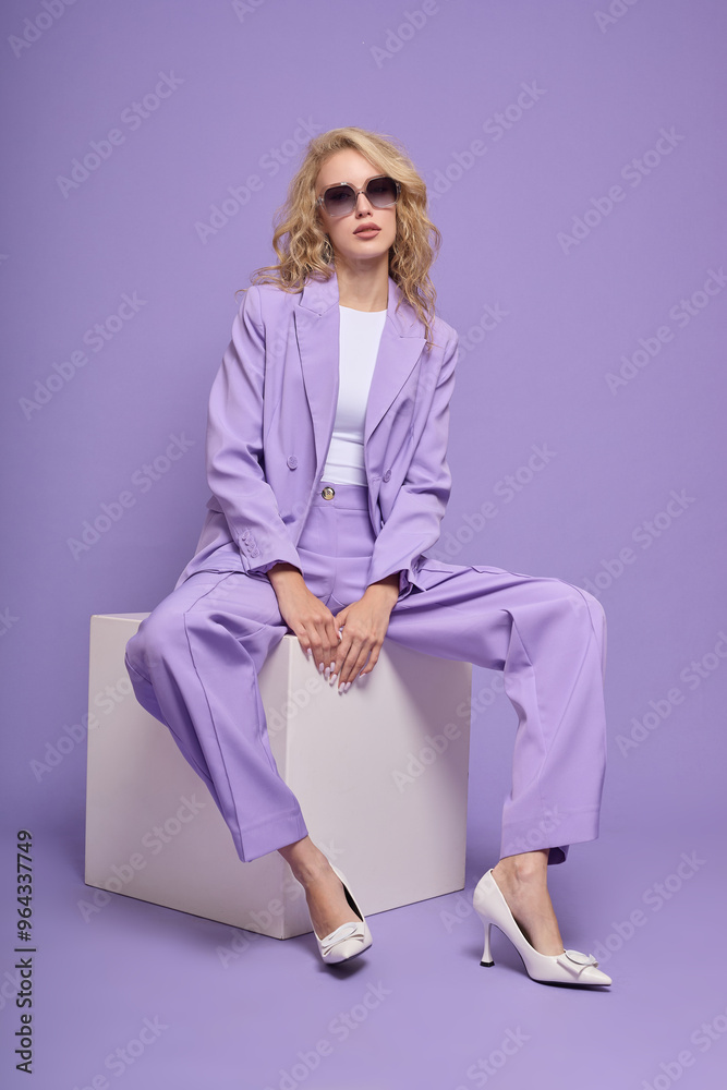 Fashion female model in lilac suit, white shoes, top and sunglasses.