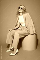 Fashion female model in lilac suit, white shoes, top and sunglasses.