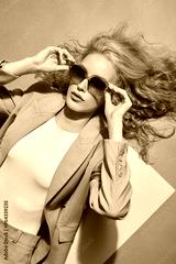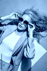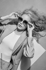 Fashion female model in lilac suit, white shoes, top and sunglasses.