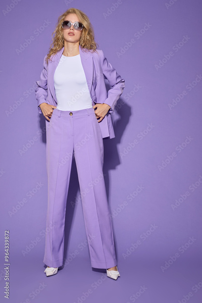 Fashion female model in lilac suit, white shoes, top and sunglasses.