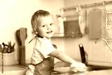 Toddler child washing dishes in kitchen. Little boy having fun with helping to his mother with housework