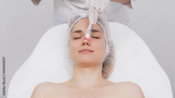 A cosmetologist applies a luxurious face cream in a contemporary beauty clinic, emphasizing cutting-edge skincare methods. Perfect for promoting high-end spa services in your marketing materials.