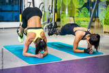 Woman exercising with suspension straps in fitness club or gym.