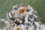 Pseudaulacaspis pentagona, the white peach scale or mulberry scale, family Diaspididae. Serious plant pest. An insect colony on the bark of a tree in the garden.