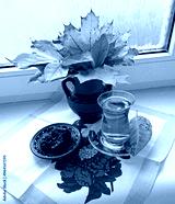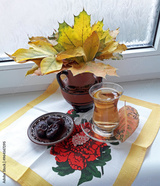 Autumn time and fall creative motifs at home. Autumn still life. Maple leaves in ceramic (clay) jug and a glass of tea with prunes. A non-standard composition on the windowsill on the autumn's theme
