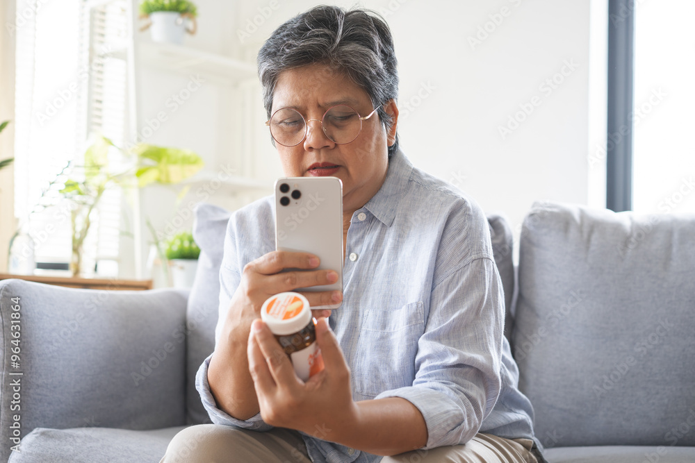 Health care concept, asian senior woman using smart phone reading, searching prescription on bottle medicine, pill label text about information online, instructions side effects, pharmacy medicament.