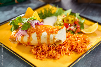 Delicious Mexican Burrito with a Side of Rice, Served on a Colorful Plate