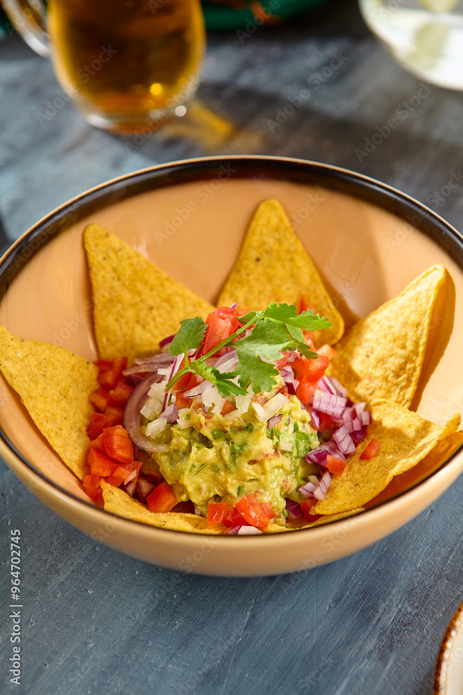 Fresh Guacamole with Tortilla Chips and Garnishes on a Table
