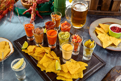 Assorted Dips and Sauces with Nachos - Snack Platter with Beer