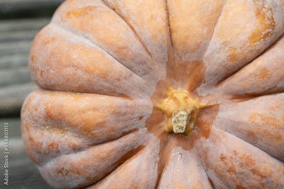 Close-up of an orange-coloured nutmeg pumpkin. The pumpkin is photographed from above. It lies on a background of weathered wood.
