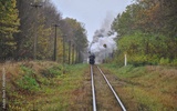 train in the countryside. a railway through an autumn forest and a steam locomotive in the distance.