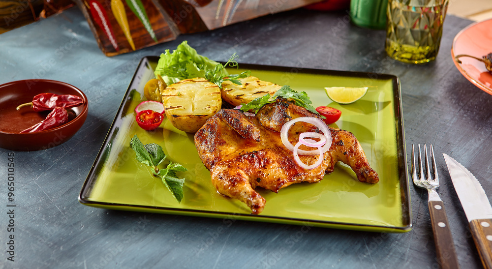 Grilled Chicken with Potatoes on a Green Plate - Vibrant, appetizing meal with artistic presentation and vivid lighting