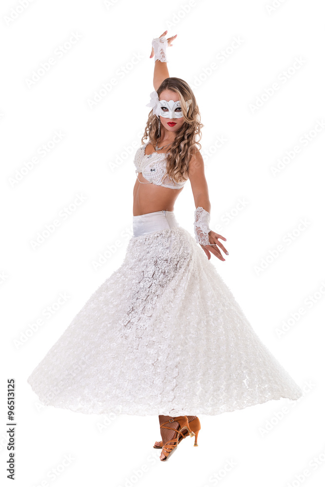 Carnival dancer girl wearing a mask dancing, isolated on white
