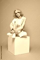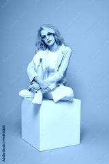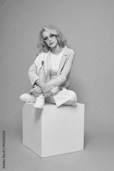 Fashion female model in pink jacket, white culottes jeans, sneakers, top and sunglasses.