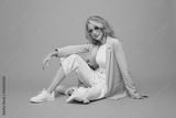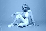 Fashion female model in pink jacket, white culottes jeans, sneakers, top and sunglasses.