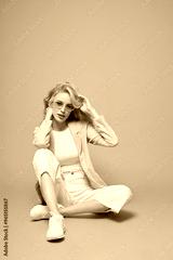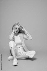 Fashion female model in pink jacket, white culottes jeans, sneakers, top and sunglasses.