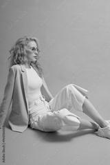 Fashion female model in pink jacket, white culottes jeans, sneakers, top and sunglasses.