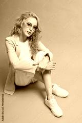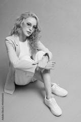 Fashion female model in pink jacket, white culottes jeans, sneakers, top and sunglasses.