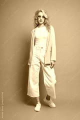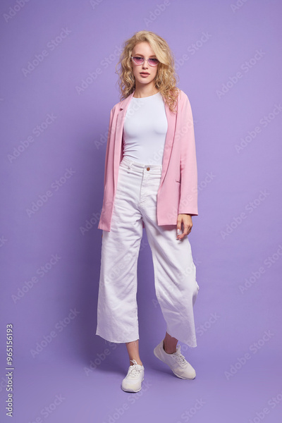 Fashion female model in pink jacket, white culottes jeans, sneakers, top and sunglasses.