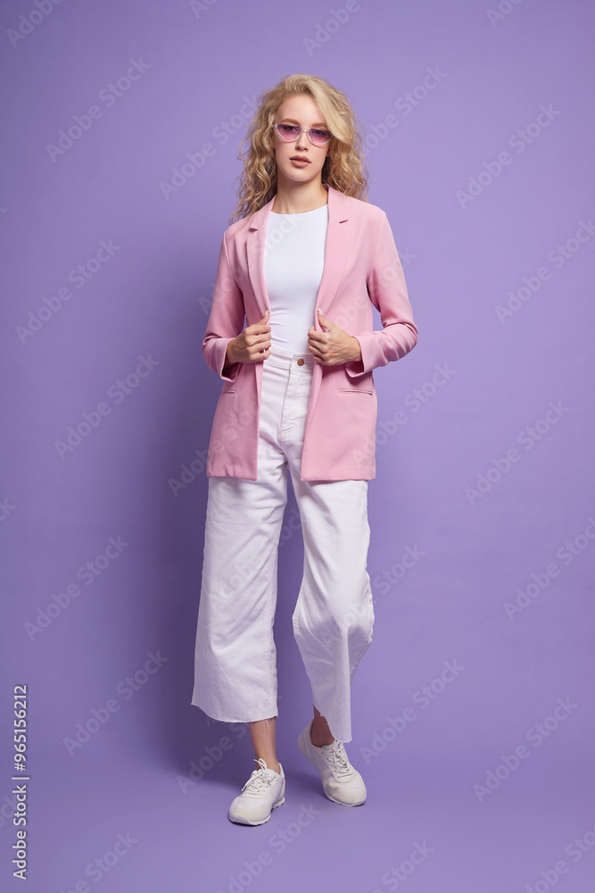 Fashion female model in pink jacket, white culottes jeans, sneakers, top and sunglasses.