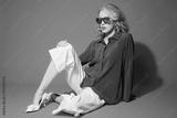 Fashion female model in blue pleated blouse, white culottes jeans, heels shoes, and sunglasses.