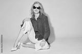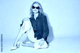 Fashion female model in blue pleated blouse, white culottes jeans, heels shoes, and sunglasses.