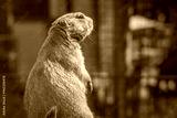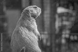 A gopher standing on hind legs, viewed from behind. Text space
