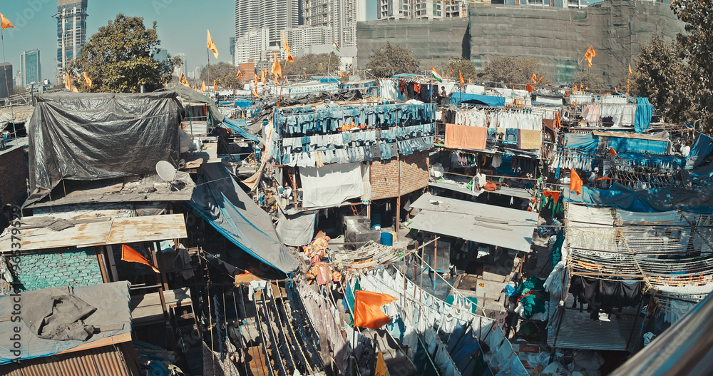 Mumbai, India. View On Dhobi Ghat And Modern Skyscrapers. Dhobi Ghat Is Open Air Laundry. One Of Largest Outdoor Laundry. Popular Attraction Among Foreign Tourists. Class Differences Between People
