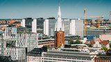 Stockholm, Sweden. Elevated View Of St. Clara Or Saint Klara Church In Summer Sunny Modern Cityscape Skyline