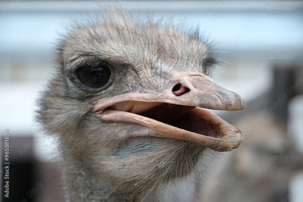 African ostrich head close up on ostrich farm. funny ostrich. ostrich portrait