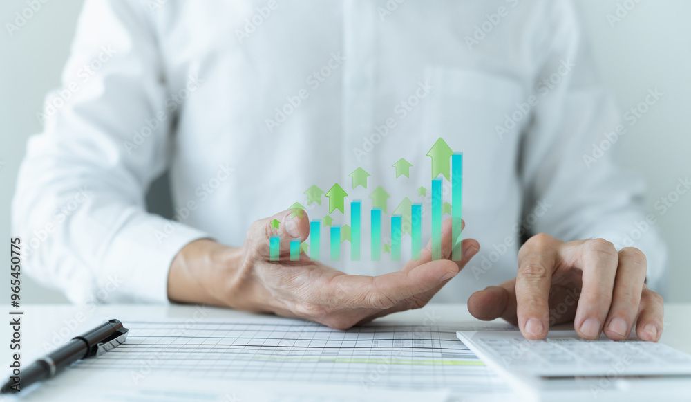 Businessman working with growth chart of financial and banking, revenue and income or wealth and profit. Success idea of business strategy and planning in investment and target achievement concept.