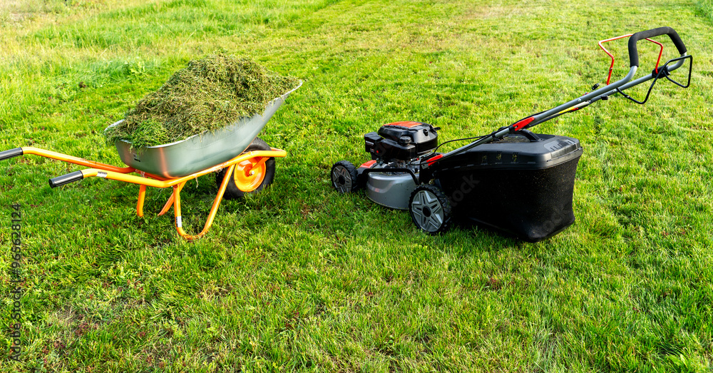 Lawnmower on a green lawn with a wheelbarrow for mowing the lawn