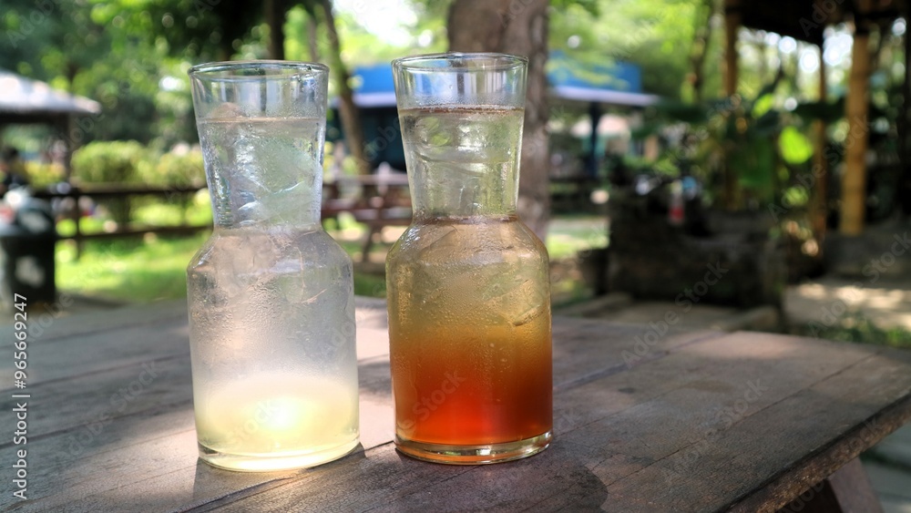 Side view iced tea and iced lime drink served with unique shaped glass, fresh cooled drink