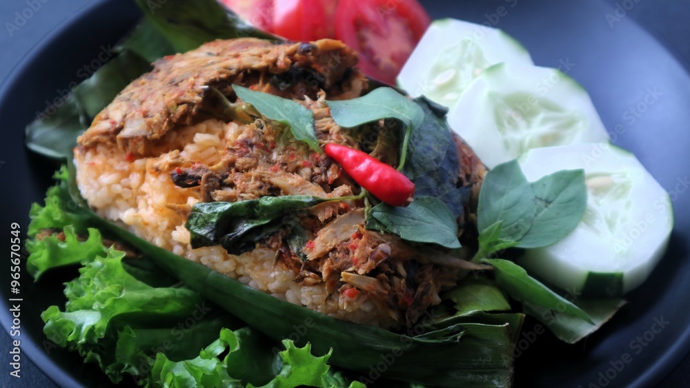 Grilled rice wrapped in banana leaves served with sliced cucumber and tomatoes on black round plate, isolated on black background