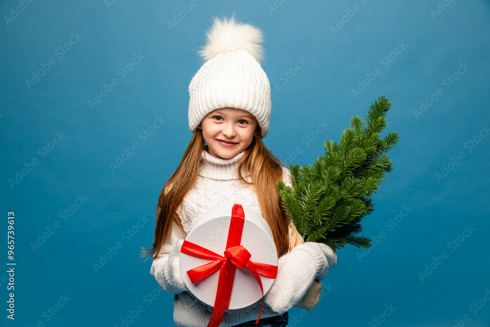 Happy child little girl in a white sweatshirt and knitted hat with pompom holds Christmas tree and gift box on a blue background. Happy New Year holiday concept. Copy space. High quality photo