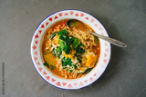 Delicious spicy noodles served on a white plate with silver spoon, garnished with fresh vegetables and a perfectly cooked egg, set against a gray background