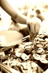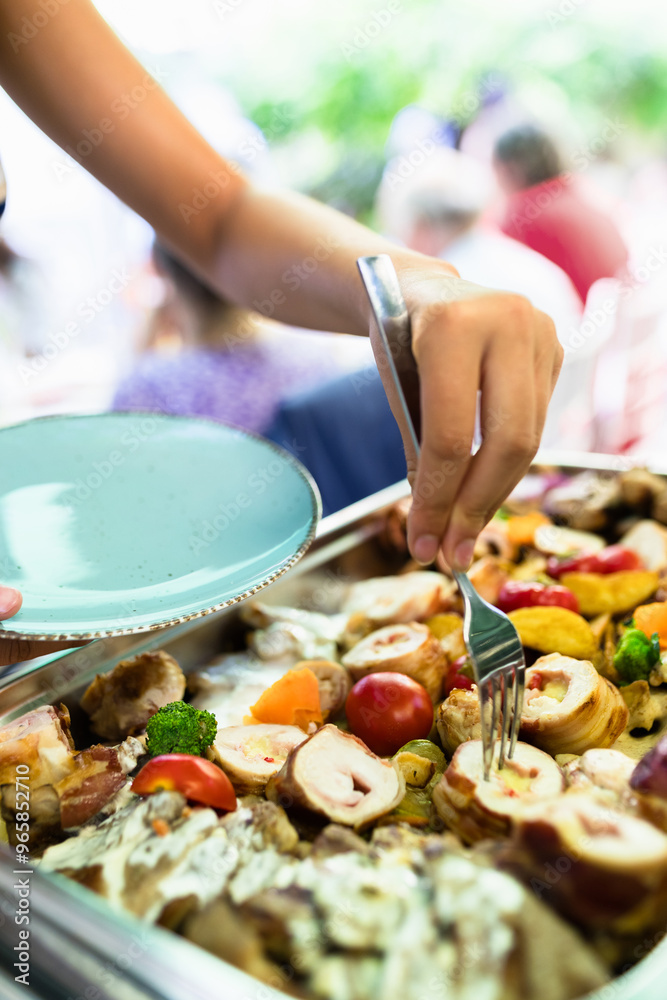 A person serving colorful, appetizing food at a gathering in a garden during a sunny afternoon