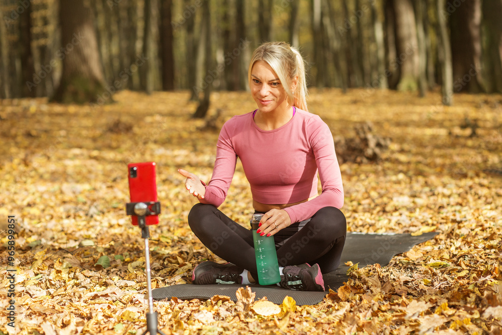 Woman filming fitness vlog outdoors in autumn forest.