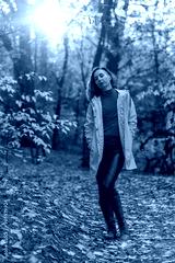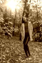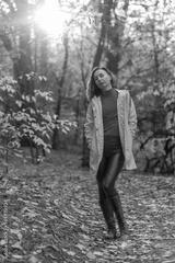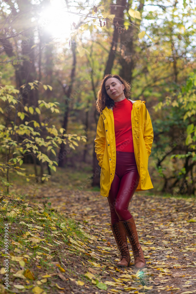 A young woman in a yellow raincoat and leather pants poses in the autumn forest