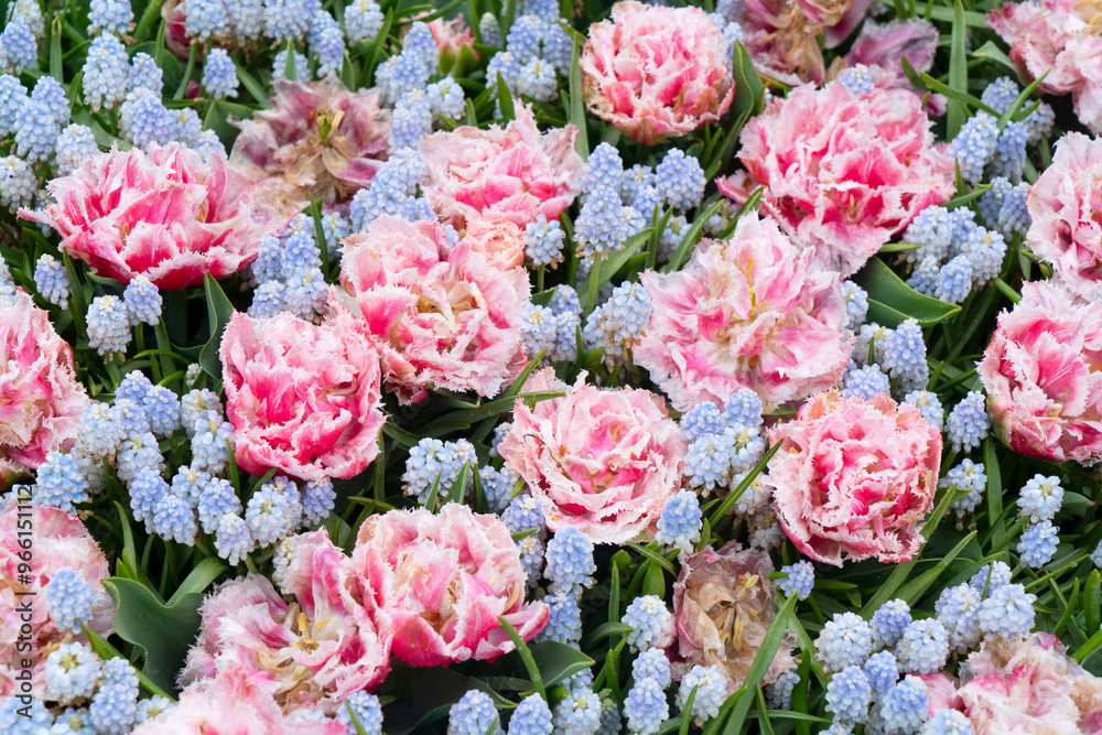 Famouse dutch red tulip field with rows in sunny day with blue sky