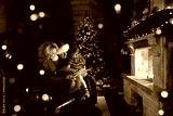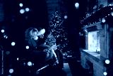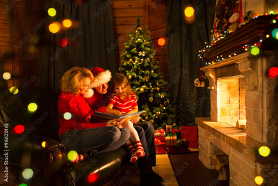 Happy family reading a book by a Christmas tree in cozy living room in winter