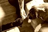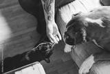 A person with a tattoo extends their hand to feed a black cat, while a brown and white dog watches nearby. The setting is cozy, with wooden flooring and a soft couch.