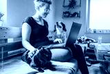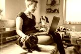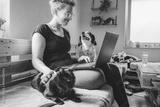A woman sitting on a wooden sofa, working on a laptop. A black cat is resting on her lap, while a dog is playfully behind her. The room has plants and a cozy atmosphere.