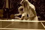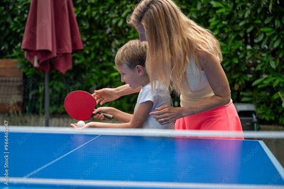 Mother teaching her toddler son how to play table tennis