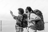 young african american couple tourists with hiking equipment and backpacks standing near the sea and taking selfie on smartphone, man and woman traveling with tents and photographing horizon on mobile