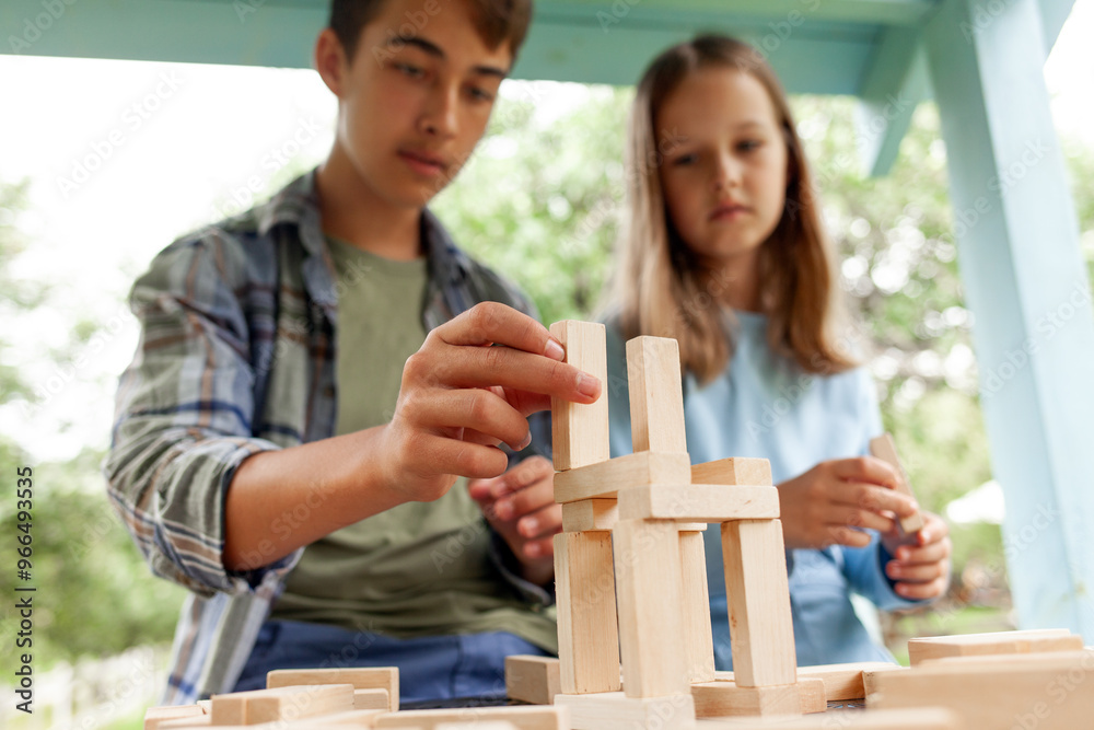 children teenagers playing board educational game in garden outdoors, young boy and girl building tower with wooden blocks and smiling, brother and sister competing in jenga
